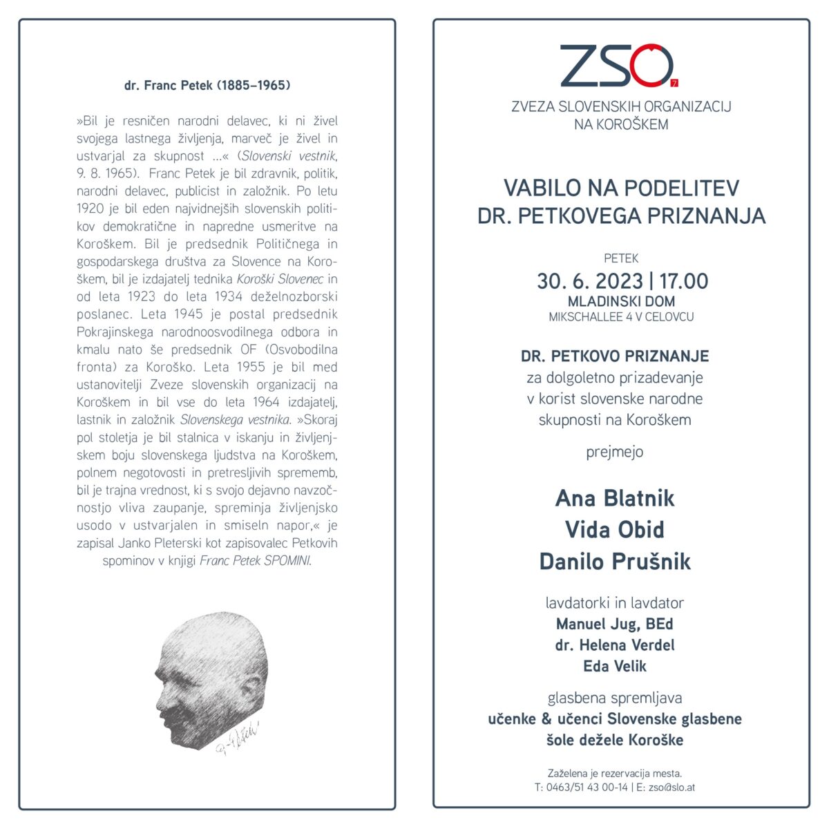 Zveza slovenskih organizacij podeljuje dr. Petkovo priznanje osebam, ki so s svojim angažmajem in delom v korist slovenski narodni skupnosti na Koroškem doprinesli tehten in pomemben delež k obstoju in razvoju slovenske manjšine. Nagrajenci dr. Petkovega priznanja:Ana Blatnik • Vida Obid •...